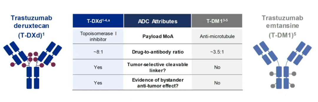 T-DXd和T-DM1都是ADC类药物,由曲妥珠单抗、连接子、载荷药物三部分组成,二者主要有以下区别:首先是载荷药物不同,T-DM1连接的是美登素衍生物DM1,而T-DXd连接的是拓扑异构酶-I 抑制剂,是一种强效、广谱的喜树碱类衍生物。其次,T-DM1的硫醚连接子不可裂解,而T-DXd的四肽连接子是可裂解的,在局部释放出的药物可以透过细胞膜进入邻近的肿瘤细胞而发挥旁观者效应。再者是T-DXd具有更高的药物抗体比(DAR),大约为8,而T-DM1的DAR大约为3.5,也就是说T-DXd每个HER2抗体上载荷的化疗药量比T-DM1更高。这些药物机制特征可以解释为什么T-DXd具有更高的疗效,这在DB-01、DB-03等研究中已经得到证实。
