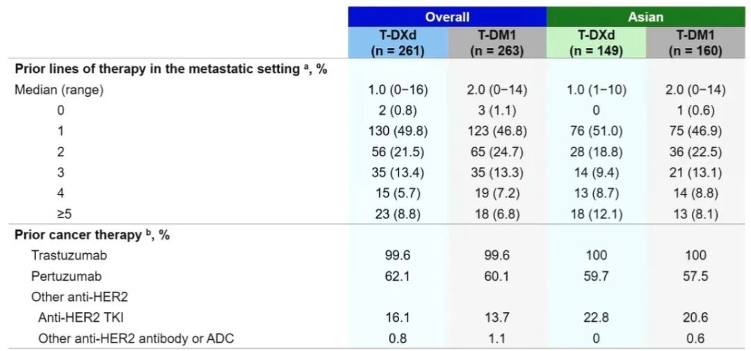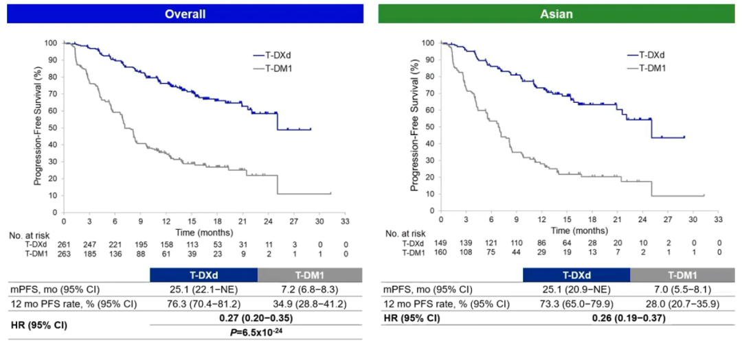 总体上,该研究中亚洲人群和全球人群的基线特征是一致的。我们可以看到,亚洲入组患者中T-DXd组和T-DM1组:有脑转移病史的比例分别为22.1%和22.5%,基线有脑转移病灶的比例分别为16.1%和18.8%;两组患者中有近一半是2线治疗(51.0%vs 46.9%),≥3线治疗也占了近一半;两组中大约60%的患者既往接受过帕妥珠单抗的治疗(59.7%vs 57.5%)。以上这些特征与全球人群基本一致。然而,与全球人群不太一样的是,亚洲人群中的TKI经治比例(22.8%vs 20.6%)比全球人群(16.1%vs 13.7%)更高。