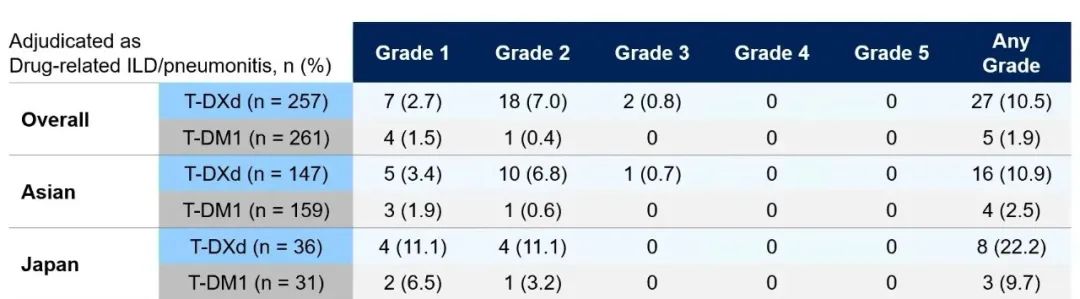 间质性肺病(ILD)/肺炎是临床比较关注的不良事件,亚洲和全球人群的ILD发生率相似(10.9%vs 10.5%),而且均以1-2级为主,没有发生4-5级的严重ILD/肺炎。日本人群相较于全球人群和亚洲人群,观察到更高比例的ILD/肺炎发生(22.2%vs 10.5%vs 10.9%),但在日本人群中没有观察到≥3级的ILD/肺炎事件。从这些安全性数据来看,亚洲人群T-DXd治疗的安全性、耐受性总体上与全球人群一致,是安全、可控的。