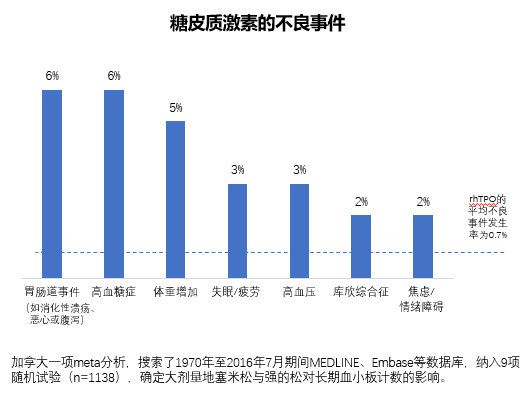 但在另一方面,ITP的治疗仍存在诸多的挑战和棘手问题,主要体现于以下方面:①糖皮质激素作为一线治疗手段,其长期疗效欠佳且可能导致颇多的治疗相关不良反应,例如激素相关的糖尿病、骨质疏松、股骨头坏死、感染及血栓等,这是不容忽视的问题。在加拿大的一项meta研究中,纳入了9项RCT研究的1138例ITP患者,结果显示,长期大剂量的地塞米松可导致一系列不良反应,主要有胃肠道事件(消化性溃疡等,6%)、高血糖(6%)、体重增加(5%)、高血压(3%)及库欣综合征(2%)等,详见下图1。