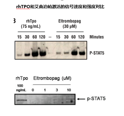 作为TPO-RA的一种,罗普司亭具有诸多优势:①可激活更多促进巨核细胞的增殖下游信号通路:与小分子非肽类TPO-RA相比,罗普司亭可使TPO受体磷酸化,会激活更多的下游信号通路,包含JAK2-STAT5、STAT3、PI3K/AKT等,对于AKT和JAK-STAT通路的激活作用强于小分子非肽类TPO,这对于促进巨核细胞的增殖和成熟有突出价值,而小分子药物艾曲泊帕没有AKT和STAT3信号通路。此外,与非肽TPO-RA(如艾曲波帕,海曲泊帕等)相比,罗普司亭、rhTPO等激活JAK2和STAT5通路时信号强度更高,速度也快一倍(30minvs60min)。