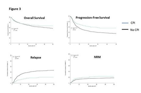 本研究的重点是alloHCT治疗前使用了CPI治疗会不会加剧GVHD等并发症,甚至带来其他更坏的结果?通过对1729名病例的分析,数据表明在alloHCT前使用CPI治疗能提高患者PFS,并降低复发率,但对患者OS和NRM没有明显影响。在对并发症的影响方面,先前的CPI治疗会提高2-4级 aGVHD的发生率,但与3-4级 aGVHD 和 cGVHD的累积发生率无相关性。