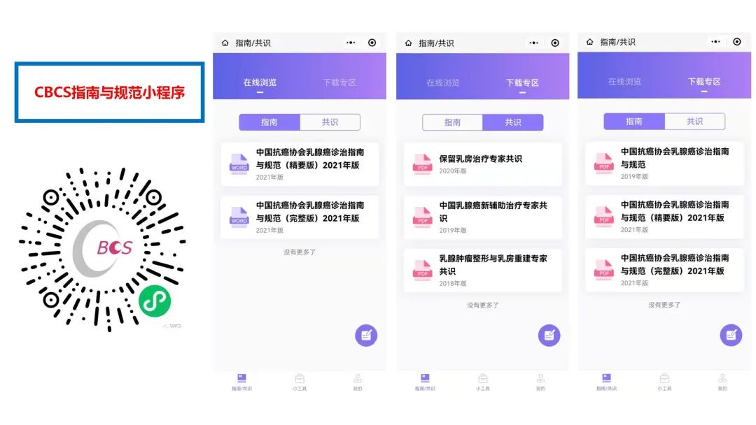 为了更好地对CACA-CBCS指南进行推广,我们将指南完整版和“精要版”都放到了“CBCS指南与规范小程序”中。同时,小程序中还包涵中国抗癌协会乳腺癌专业委员会领导下制定的诊疗规范、相关共识以及临床实践中可能用到的小工具,便于大家在工作岗位中进行运用。