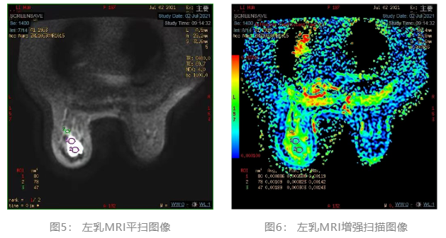 2021.07.02 乳腺 MRI平扫+增强:左乳上象限不规则强化肿块,BI-RADS-MRI 5类,考虑乳腺癌。左侧腋窝稍增大淋巴结。(图5、6)