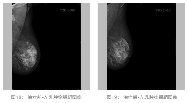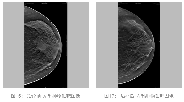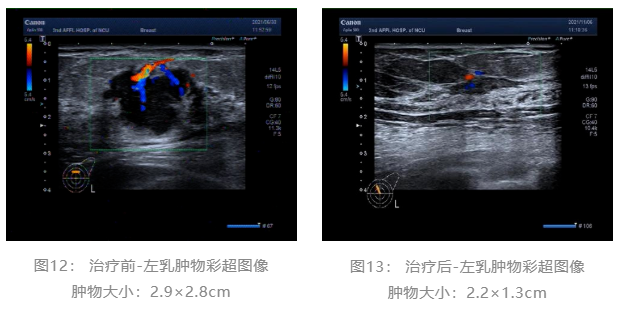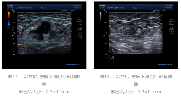 术前评估:新辅助治疗期间患者无明显不适,一般状况可。新辅助治疗后左乳房肿瘤及腋下肿大淋巴结退缩明显,疗效评估PR,未发生不良事件,择期可行左乳癌改良根治术。