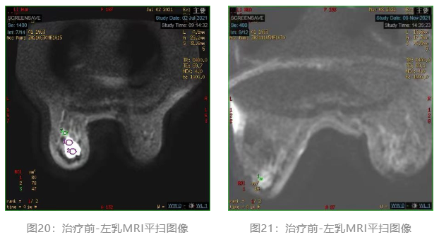患者于2021年11月10日在我院于全麻下行左乳癌改良根治术。术后病理示:(左乳)肿瘤瘤床部位无浸润癌组织,间质纤维组织增生伴玻璃样变,局灶淋巴细胞浸润,符合新辅助治疗后改变(Miller Payne分级:G5)。皮肤切缘、基底切缘及乳头均未见癌累及。腋窝找及淋巴结20枚,均未见癌转移。