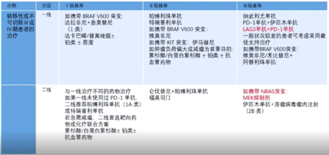 在不可切除或IV期,增加了阿替利珠单抗+贝伐珠单抗的III级推荐。国内北京大学肿瘤医院领导的II期研究显示,阿替利珠单抗联合贝伐珠单抗作为黏膜黑色素瘤的一线治疗,有效率可达32%。