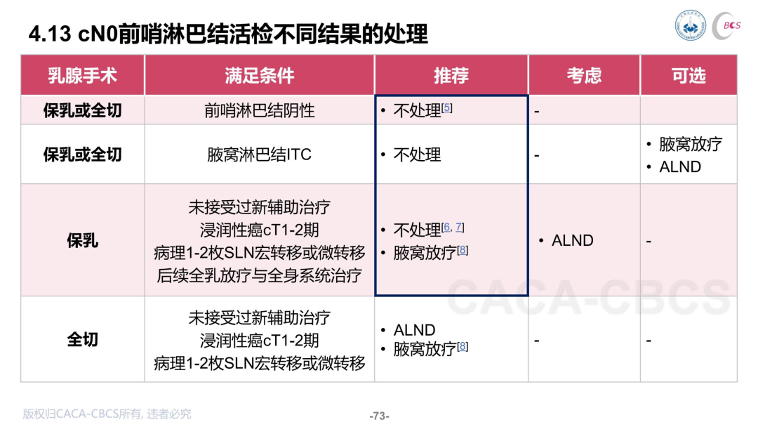 对于cN0保乳或全切,且前哨为阴性或腋结内孤立性肿瘤细胞(ITC)的患者,CBCS指南建议无需腋窝后续处理,这主要基于NSABP B-32研究显示未腋清和腋清的OS无显著差异。对于保乳或全切,且前哨1-2枚宏转移或微转移的cT1-2患者,指南推荐无需后续处理或可以进行腋窝放疗替代腋窝清扫,这主要基于ACOSOG Z0011、IBGSG 23-01、AMROS等研究提供的证据。