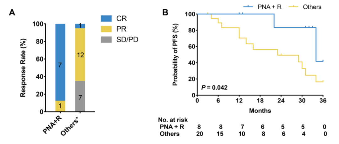 图2.不同一线治疗方案的疗效:A PNA+R治疗组完全缓解率明显高于其他治疗组;B PNA+R治疗组患者3年无进展生存率明显高于其他治疗组。PNA+R,克拉屈滨/苯达莫司汀联合利妥昔单抗;其他治疗,克拉屈滨/氟达拉滨、干扰素或瘤可燃±切脾等。