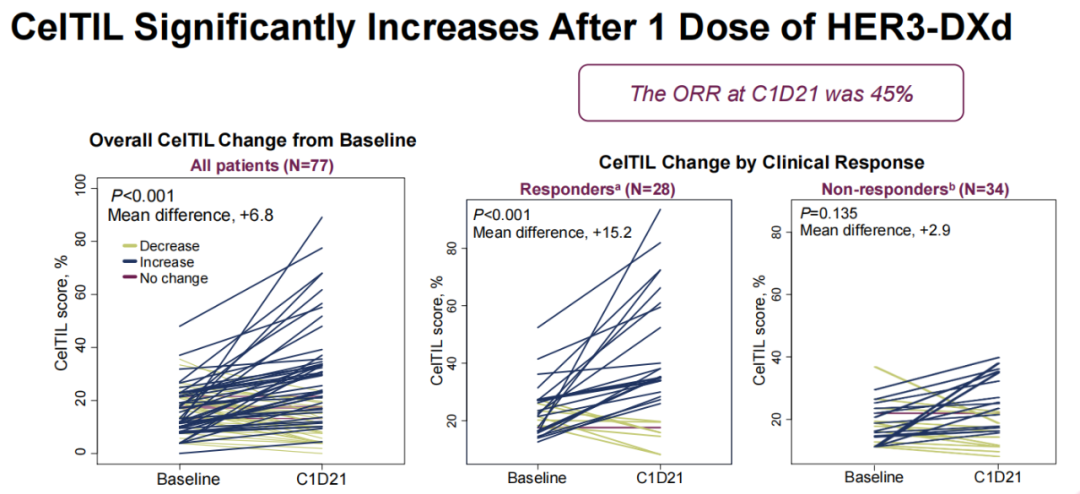 研究中患者的ORR为45%。CelTIL在C1D21时显著升高(平均差异+6.8,p<0.001),但这种增加趋势仅在有缓解的患者(p<0.001)中观察到,在病情稳定的患者(p=0.135)中没有看到。