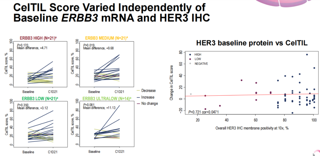 非Luminal亚型和高复发风险评分与CelTIL的高反应相关。治疗前ERBB3 mRNA水平与CelTIL的变化或临床应答无关,治疗后配对Ki67显著降低(p<0.001),而ERBB3 mRNA未出现显著降低(p=0.13)。在C1D21时,患者免疫基因被诱导,增殖基因被抑制(假发现率=5%)。CelTIL评分独立于基线ERBB3 mRNA和HER3免疫组水平。