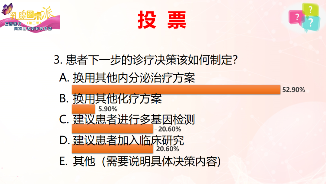 网上医生投票结果揭晓:约半数患者同意换用其他内分泌治疗方案,五分之一患者建议进行多基因检测,五分之一患者建议加入临床研究。
