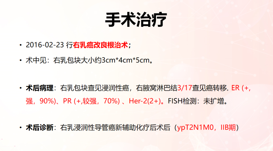 闫敏教授:DS-8201目前也在进行针对HER2低表达人群的研究,我们也是参研中心之一,也在等待具体数据的公布。现在也有一些数据证明ADC药物在HER2低表达人群的治疗中有一定的潜力,可以尝试。对于该例患者,我也建议其进行多基因检测,如BRCA1/2基因检测、PI3K检测等,以进一步选择其他治疗药物。