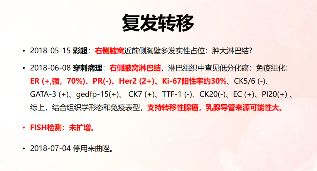王涛教授:该患者转移前ER、PR均为强阳性,HER2阴性,转移后也为ER强阳性,按照当前的指南和规范,大家都会推荐患者使用CDK4/6抑制剂联合内分泌治疗的方案,因为患者目前没有内脏危象,仅有软组织转移,既往内分泌治疗敏感(来曲唑治疗两年后复发)。但患者复发转移时间在2018年,考虑当时CDK4/6抑制剂在我国不可及,基于这个原因,我也会考虑内分泌治疗,在当时环境下,有mTOR抑制剂可选择,如果患者由于经济原因或其他因素不可用,我也会推荐患者单用内分泌治疗(考虑SERD药物氟维司群)。