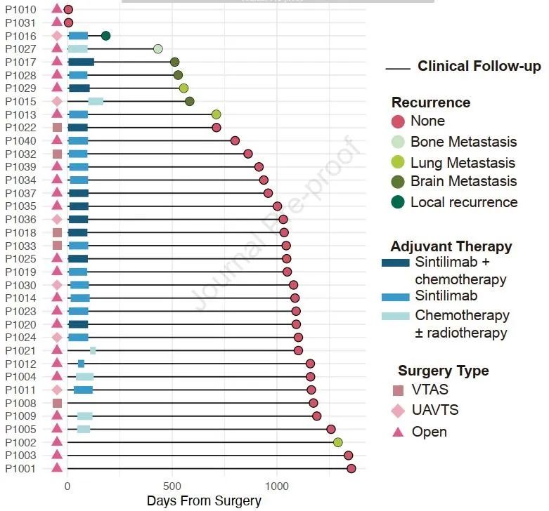 研究结果:研究共筛查了43例患者,最终40例患者入组,这40例患者中,分别有80%和82.5%的患者既往有吸烟史,病理诊断为鳞癌;I期、II期、IIIa期和IIIb期患者占比分别为20%、30%、25%和20%。32例患者接受PD-L1检测,其中55%的患者检测阳性,37例患者接受手术切除,其中1例患者为R2切除,其余均为R0切除。术后分别有40.5%、27.0%和10.8%的患者接受信迪利单抗单药、化疗联合信迪利单抗以及传统放化疗治疗。2例患者在术后短期内出现死亡事件,1例因术后出现严重意识障碍,另外1例为免疫相关肺炎。经过中位3年随访后,8例患者出现复发,包括:1例局部复发,3例肺转移,3例脑转移,1例骨转移,中位随访时间37.8个月。