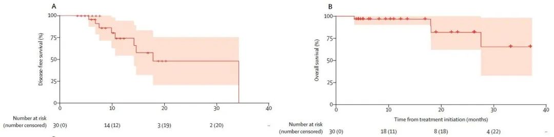 研究取得了非常瞩目的成果,结果多次在WCLC、ASCO等会议报道并最终发表于Lancet Oncology杂志。共计46例患者入组, MPR达到了83%,71%的患者出现完全病理缓解(定义为未找到肿瘤细胞),90%的患者分期下降。所有的患者均为R0切除,12个月PFS率为95.7%,18个月PFS率为87%,24个月的PFS率为77.1%,在修订的ITT人群中,12个月、18个月和24个月的OS率分别为97.8%、93.5%和89.9%。从安全性来看,全组3度及以上不良反应发生率为30%,在新辅助治疗阶段无不良反应导致治疗中止、手术延迟或死亡。在术后辅助治疗阶段,14%的患者因不良反应导致治疗终止。2021年WCLC,该研究公布了最新的研究数据,全组患者中位随访37.9个月,更新后的数据显示,14例患者出现疾病进展,9例患者出现疾病死亡,36个月和42个月的PFS率均为69.6%,36个月和42个月的OS率分别为91.0%和87.3%。