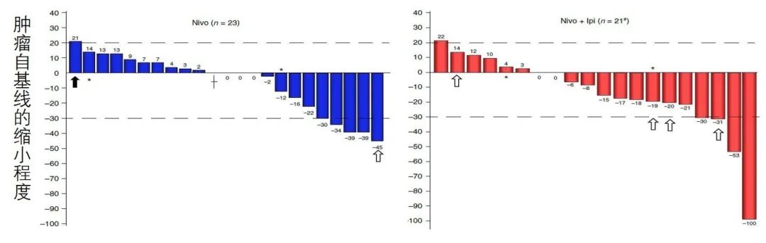 代表性的研究为NEOSTAR研究,数据发表于Nature Medicine杂志。这是一项小型II期随机对照研究,符合入组标准的患者按照1:1的比例随机分为 Nivolumab单药(3 mg/kg,第1天、第15天和第29天给药)或Nivolumab联合Ipilimumab (3 mg/kg,第1、第15、第29天给药,联合Ipilimumab 1 mg/kg,第1天给药)。单药组和联合组分别入组23例和21例患者。单药组MPR为22%,联合组为38%,P=0.235。联合治疗组超过6例患者取得主要病理学缓解,达到研究主要研究终点。两组分别有2例和6例患者达到p-CR。两组的影像学ORR分别为22%和19%。