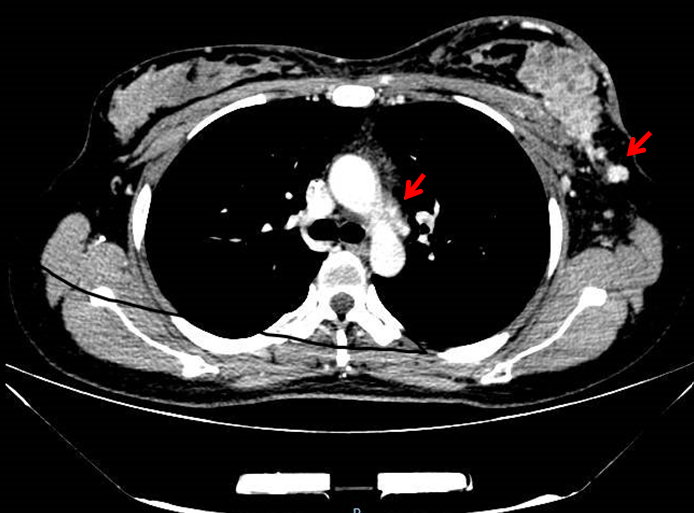 2.胸部增强CT:左乳腺体及胸壁内见多发结节影,部分相融,增强扫描可见明显强化;皮肤增厚并见强化结节;左侧腋下见多发肿大淋巴结显示,(最大者短径0.8cm非靶病灶),可见强化;左侧胸壁增厚,见强化。双侧胸廓对称,纵隔居中。双肺未见异常密度影,气管及主支气管通畅,双肺门不大,双侧胸膜未见明显增厚。纵隔内增大淋巴结显示(短径0.5cm,非靶病灶),可见强化。(图2)