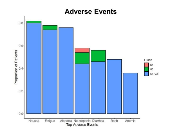 在安全性方面,戈沙妥珠单抗也表现良好。最常见的AE包括恶心(82%,n=41),乏力(78%,n=39),脱发(76%,n=38),中性粒细胞减少(58%,n=29), 贫血(36%,n=18)及皮疹(48%,n=24)。仅6%患者出现剂量减低,没有患者由于疾病进展或AE而停药,仅有一例患者因病灶缓解不理想由研究者主动停药。