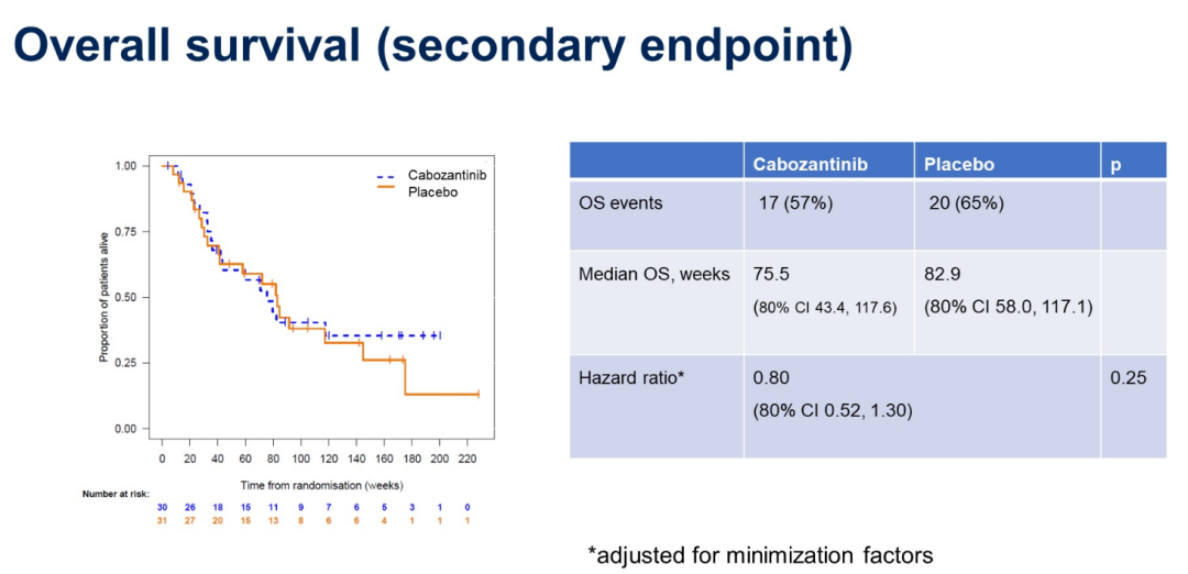 卡博替尼组和安慰剂组共发生25例(83.3%)和26例(83.9%)PFS事件,中位PFS分别为13.7周(80%CI:12.1-23.3)和15.8周(80%CI:11.3-23.6)(调整后HR 0.89,80%CI:0.61-1.3,P=0.35)。OS无显著差异(HR 0.80,80%CI:0.52-1.23,P=0.25)。