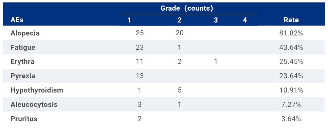 PK数据显示全身水平中没有N-803,表明仅作用于膀胱局部。低级别治疗相关不良事件(1-2级)包括排尿困难(22%)、尿频(19%)、血尿(18%)、疲劳(16%)和尿急迫(12%),所有其他不良事件的发生率均在7%或以下。未发现与治疗相关的4级或5级不良事件。没有严重不良事件(SAE)被认为与治疗相关。未发现免疫相关SAE。