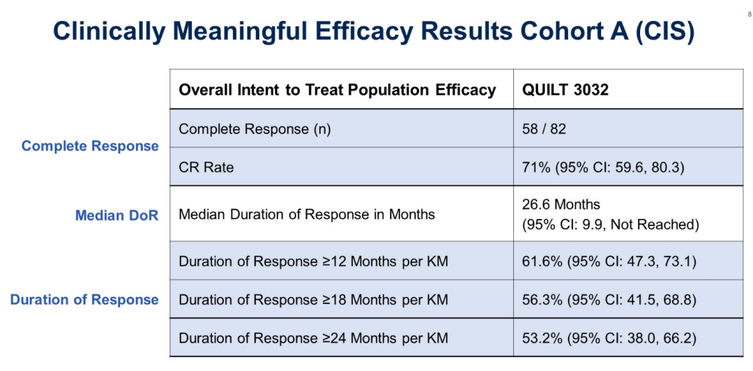 此处报告一项开放标签、3队列多中心研究(QUILT 3032),共入组了160例BCG无反应的高级别NMIBC患者,接受N-803加卡介苗膀胱灌注治疗。队列A(CIS)的主要终点是CIS在任何时候的CR率。队列B(乳头状)的主要终点是12个月时的无DFS率。