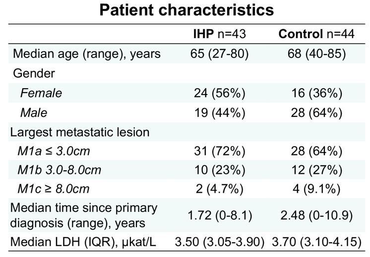 87例患者被随机分配到IHP组(43例)或对照组(44例)。在IHP组中,41例(89%)患者按照方案进行治疗,而在对照组中,49%的患者接受化疗,39%接受免疫治疗,9%接受局部治疗干预。在意向治疗人群分析中,IHP组的ORR为40%(17/43),而对照组为4.5%(2/44)(P<0.0001)。IHP组的中位hPFS为9.1个月,而对照组为3.3个月(P<0.0001)。IHP组的中位PFS为7.4个月,而对照组为3.3个月(P<0.0001)。IHP组有14例与治疗相关的严重不良事件,其中血管并发症和感染是最常见的副作用,而对照组有13例与免疫治疗相关的副作用最常见。IHP组有1例治疗相关死亡。研究结果提示,初治眼葡萄膜黑色素瘤仅肝转移患者中,与最佳替代治疗相比,IHP治疗可获得更好的ORR、hPFS和PFS。