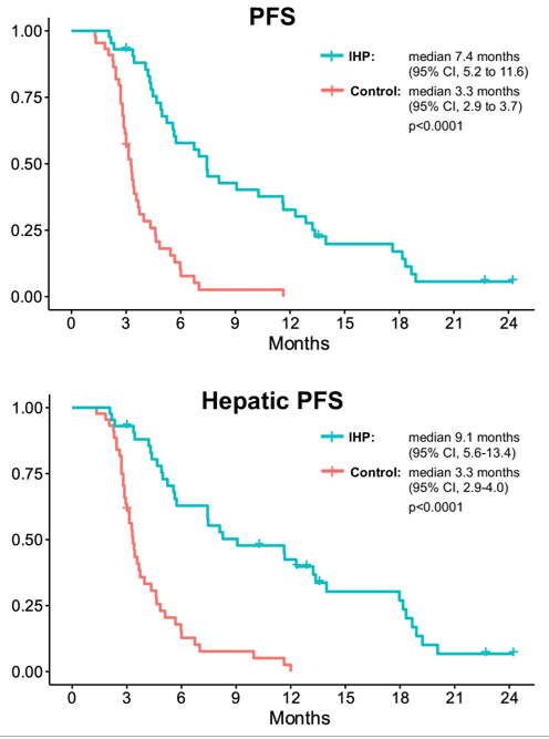研究纳入2013至2021年间初治的仅肝转移的眼葡萄膜黑色素瘤患者,按1:1随机分为IHP或最佳替代治疗组(对照组)。主要终点是24个月的总生存率,次要研究终点为无进展生存期(PFS)、肝PFS(hPFS)和安全性。根据RECIST1.1进行评估。