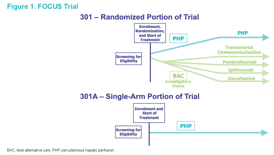 FOCUS研究起初是一项随机对照III期研究(301),比较PHP与最佳替代治疗(BAC,研究者选择TACE、帕博利珠单抗、伊匹木单抗或达卡巴嗪)用于眼葡萄膜黑色素瘤肝转移患者的疗效和安全性。后期研究修订为停止BAC组入组(301A)。301研究按 1:1随机入PHP或BAC组。301A研究中均接受PHP治疗。PHP患者最多可接受6次PHP,每6-8周重复一次治疗,马法兰给药剂量为3.0mg/kg。每12周影像学评效直到PD。主要研究终点为ORR(RECIST 1.1)。