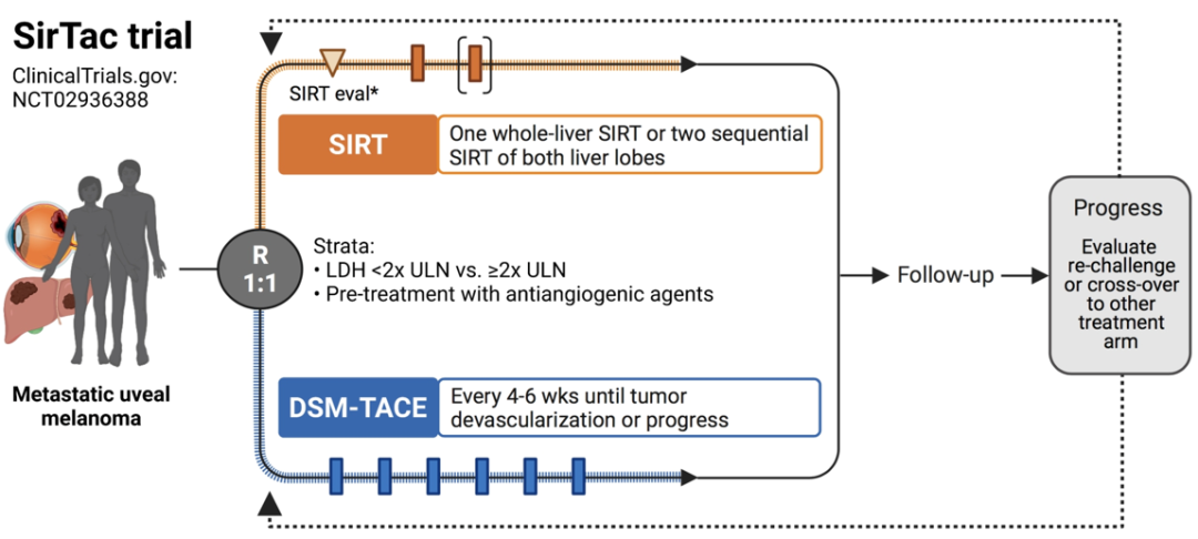 SirTac研究是一项前瞻性、随机、开放、单中心的研究者发起II期研究。研究比较了眼葡萄膜黑色素瘤肝转移患者接受SIRT(含钇-90树脂微球的选择性内放射治疗)或DSM-TACE(可降解淀粉微球-顺铂经肝动脉化疗栓塞)的疗效和安全性。研究纳入经组织学证实为眼葡萄膜肝转移、ECOG 评分0-2的患者,以1:1随机分入SIRT组或DSM-TACE组。随机化分层因素包括LDH(<2倍 vs ≥2倍正常上限)、既往抗血管生成药物治疗史。如果无症状,允许存在肝外转移。主要研究终点为无进展生存期(PFS)。计划总共纳入108例(每组54例),每4-6周进行一次TACE,直到肿瘤血管阻断或疾病进展或出现无法耐受的毒性。SIRT为一次全肝用药或两次肝叶连续用药。通过RECIST 1.1预先评估前40例患者(每组20例患者)。