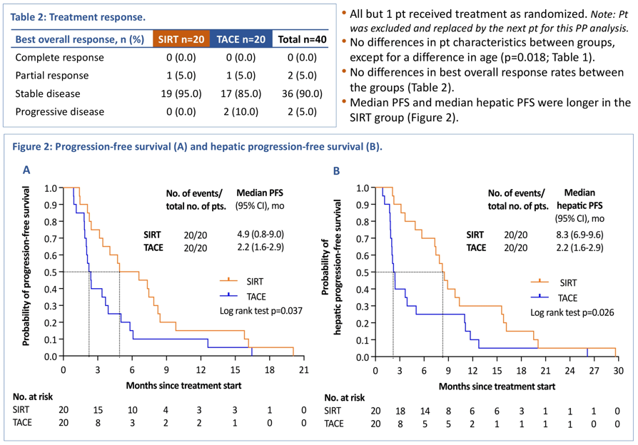 本次是第一次中期分析结果汇报。纳入患者中的其中两例曾接受过肝脏手术,而所有其他患者均未接受过转移性疾病的治疗。两组之间没有临床病理学差异,除了年龄差异(SIRT组中位年龄64岁,TACE组75岁,P=0.018)。除1 例外,其余均已随机治疗。该例被排除在外,并由下一例TACE患者代替分析。两组之间最佳总体缓解率无差异(两组均无CR患者,均1例PR,SIRT组和TACE组分别有19例(95%)和17例(85%)SD,TACE组有2例PD)。从治疗开始到随访13.9个月,SIRT、TACE组的中位PFS分别为4.9个月、2.2月(P=0.037)。SIRT组的肝转移中位PFS高于TACE组(8.3 vs 2.2月,P=0.026)。