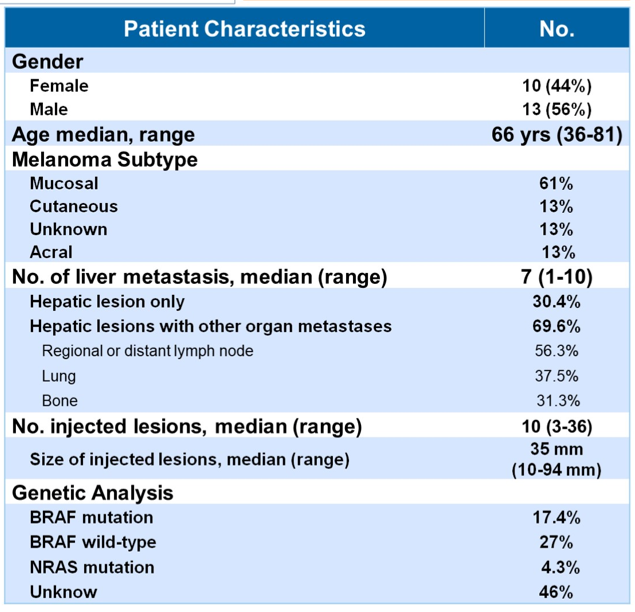 截止2022年1月,23例患者纳入研究。基线特征:中位年龄66岁;病理类型:黏膜60.9%,皮肤13.0%,原发不明13.0%,肢端13.0%;基因突变状态:BRAF 17.4%,NRAS 4.3%;69.6%伴肝外转移:局部或远处淋巴结转移56.3%,肺转移37.5%,骨转移31.3%;LDH>ULN 26.1%;注射病灶的平均大小:35mm(10-94mm);中位肝转移数目:7(1-10);中位注射次数:10(3-36)。20例患者疗效可评估。中位PFS为3.4个月,中位OS为21.5个月。ORR为15%(3/20),DCR为50%(10/20);注射病灶有效率为35%(7/20),非注射病灶有效率为27.8%(5/18),肝外转移有效率为26.7%(4/15)。术后8至12周对15例进行活检以确定TIL情况。其中,具有显著TIL浸润(根据AJCC第8版的定义,活跃n=4和非活跃n=3)的患者(7/15)的中位PFS为9.2个月,而没有显著TIL浸润为4.1个月。21.7%(2例PR和3例SD)患者活检中无黑色素瘤细胞残留,中位PFS为13.8个月,远长于其他患者的5.6个月。无黑色素瘤细胞患者的中位OS为19.7个月。研究提示特瑞普利单抗静脉给药联合肝内OrienX010瘤内注射治疗在黑色素瘤肝转移的患者中显示出显著的PFS和OS延长。