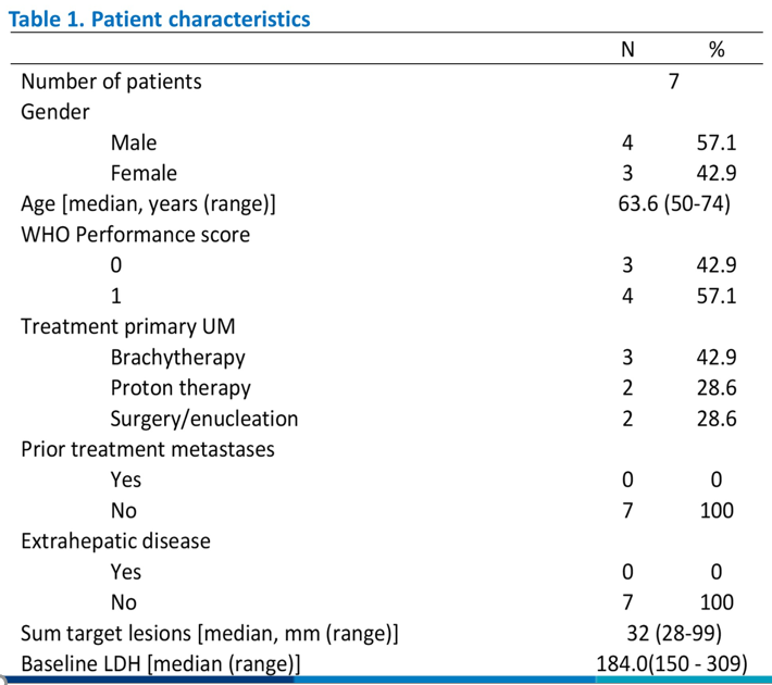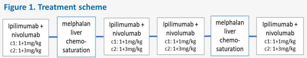M-PHP通常仅用于UM肝转移。然而,大多数患者在M-PHP后出现肝外转移。IPI+NIVO已被证明在mUM中高达20%的应答率。研究者因此设计了M-PHP和IPI+NIVO的组合方案治疗转移性葡萄膜黑色素瘤。入组患者为经证实可测量UM肝转移、ECOG评分0-1分的成年患者。两个疗程的每6周M-PHPs(马法兰 3mg/kg,最大220mg)与四个疗程的每3周的IPI+NIVO相结合(队列1:IPI±NIVO均1mg/kg;队列2:IPI 1mg/kg +NIVO 3mg/kg)。主要终点是安全性。次要终点是最佳总体反应(BOR)、PFS和OS(RECIST 1.1)。