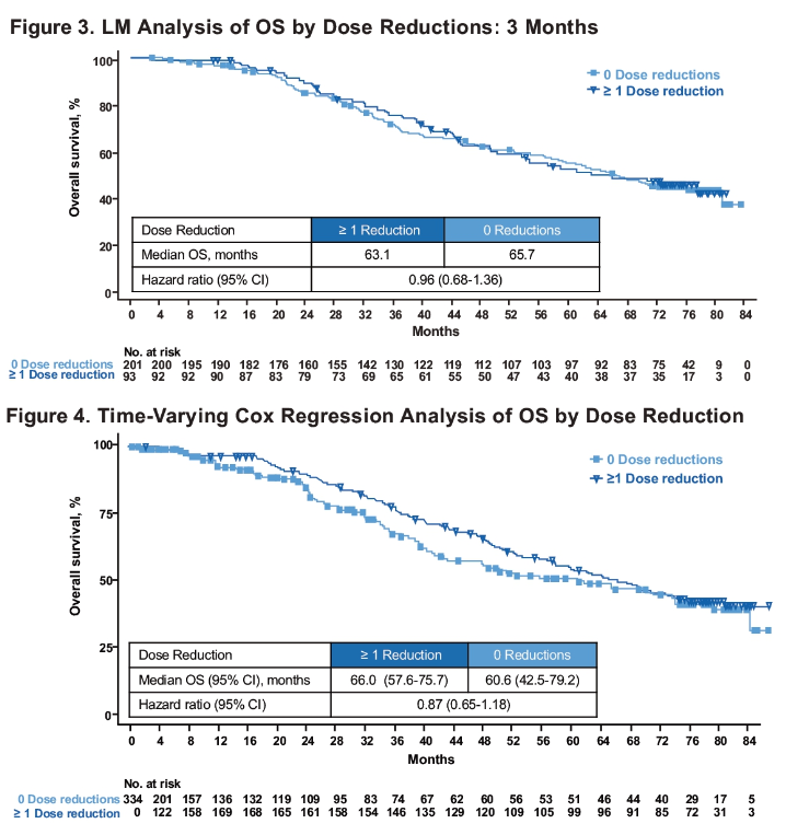 LM分析显示,RIB剂量减少≥1次患者的mOS为66.0m(95% CI:57.6~75.7),RIB未减量患者mOS为60.6m(95% CI:42.5~79.2),两组HR 0.87[95% CI:0.65~1.18]。