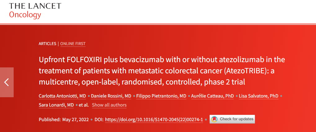[1]ANTONIOTTI C,ROSSINI D,PIETRANTONIO F,et al.Upfront FOLFOXIRI plus bevacizumab with or without atezolizumab in the treatment of patients with metastatic colorectal cancer(AtezoTRIBE):a multicentre,open-label,randomised,controlled,phase 2 trial[J].The Lancet Oncology,2022,
