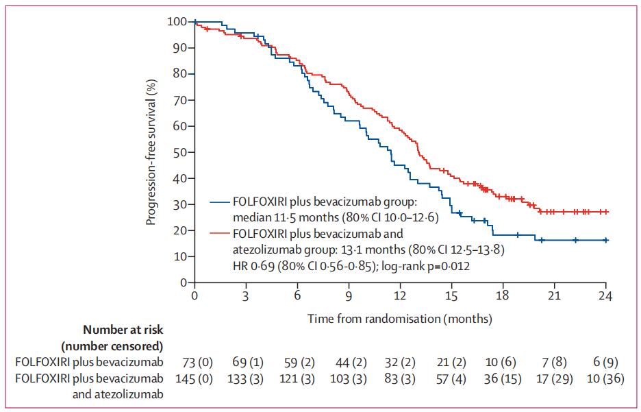 AtezoTRIBE研究表明,一线FOLFOXIRI联合贝伐珠单抗的基础上加用阿替利珠单抗(Atezolizumab)可能会改善mCRC患者的PFS,且安全性良好。