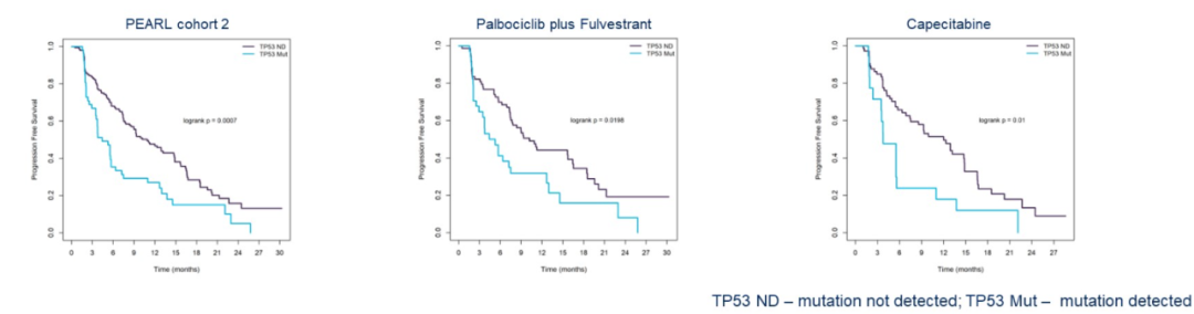结论:在PEARL队列2中,TP53突变与不良结局相关,与治疗选择无关,表明侵袭行为与内分泌抵抗无特异性相关性。在两个患者组中,药物抑制ctDNA的时间短与预后差相关。卡培他滨在C1D15抑制ctDNA的程度更大,这可能提示我们卡培他滨的抗肿瘤作用起效更快。