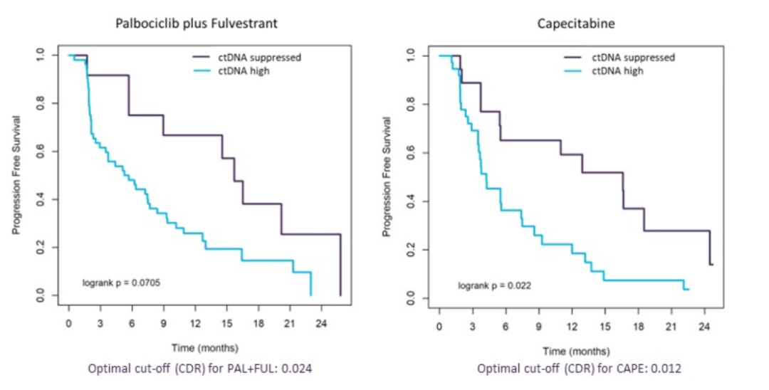 CAPE组(抑制时长16.6个月vs高ctDNA 4.2个月,HR 2.37,95%CI:0.96~5.83,P=0.05)和PAL+FUL组(抑制时长15.7个月vs高ctDNA 5.5个月,HR 2.14,95%CI:0.92~5,P=0.06)中预测PFS的最佳临界值之间存在相关性。