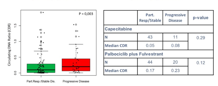 方法:从第治疗开始前7天至第1周期第1天(C1D1)的采集血浆进行ctDNA分析,用于基线和第1周期第15天(C1D15)(如可用)的预后分析,并用包含21个乳腺癌常见改变基因的内部纠错靶向捕获试验进行测序。对于预测性ctDNA动态分析,标准要求第1周期中患者至少接受14天治疗,并排除C1D1中VAF(变异等位基因频率)<0.5%(检测限)的变体。循环DNA比值(CDR)等于C1D1时潜在克隆突变的加权平均值。通过拟合一系列临界值评估预测PFS的最佳临界值,通过log-rank检验确定p值较低的临界值。在临界点Cox回归模型中,我们使用校正的p值、通过收缩因子校正的潜在高估和自助技术来计算95%CI。