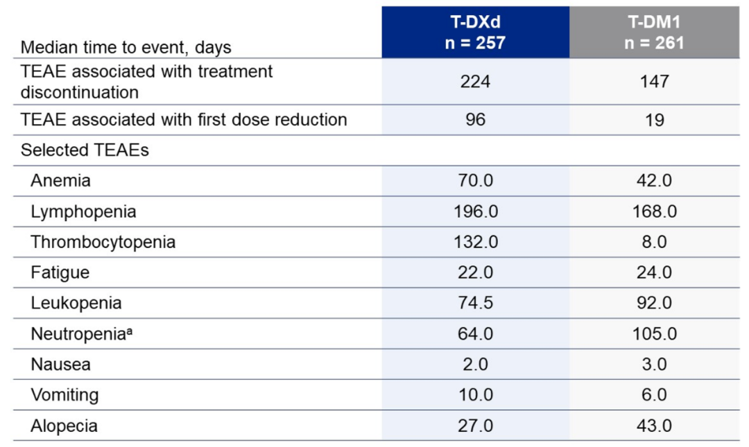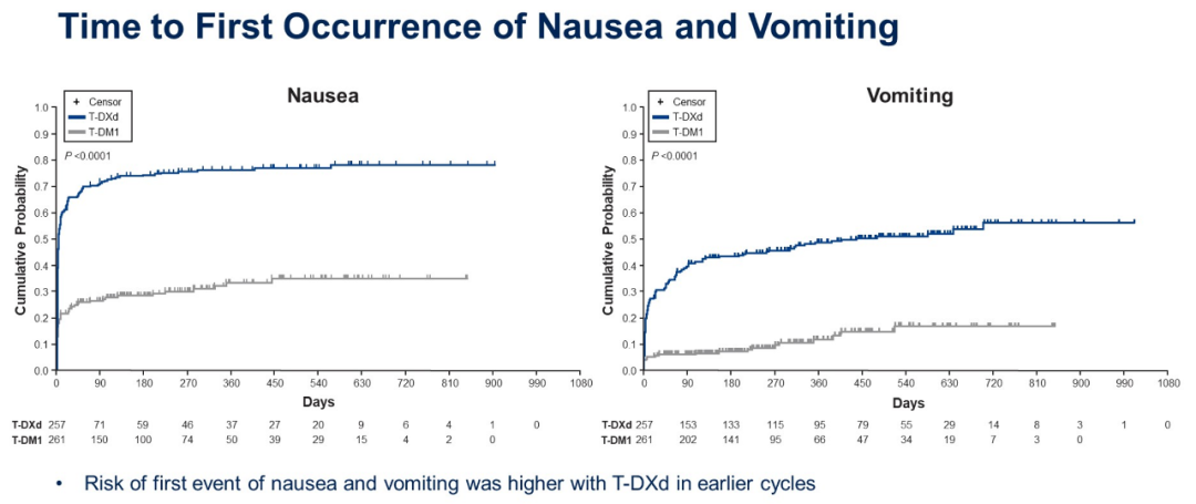 T-DXd组的至首次发生停药相关TEAE(224 vs 147天)、减药相关TEAE(96 vs 19天)的时间均比T-DM1组更加延迟。其中T-DXd组的至首次发生贫血(70 vs 42天)、粒细胞减少(196 vs 168天)、血小板减少(132 vs 8天)、呕吐(10 vs 6天)的时间均比T-DM1组更加延迟。