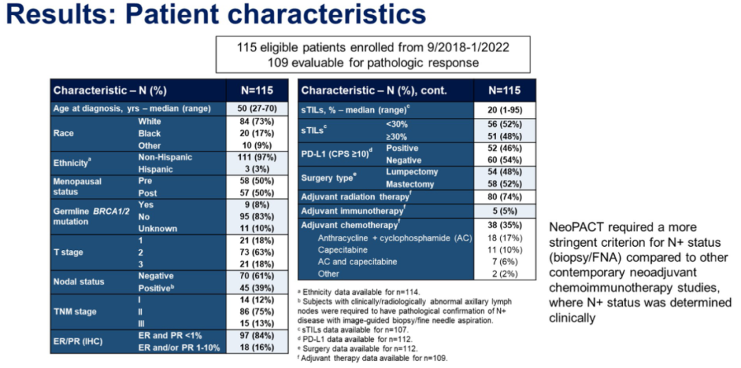 研究结果表明,2018年9月至2022年1月共纳入117例患者,其中18%是非洲裔美国人,39%淋巴结阳性,88%为Ⅱ/Ⅲ期,15%ER/PR为低表达(1%~10%)。其中105例患者的治疗病理反应结果可用。