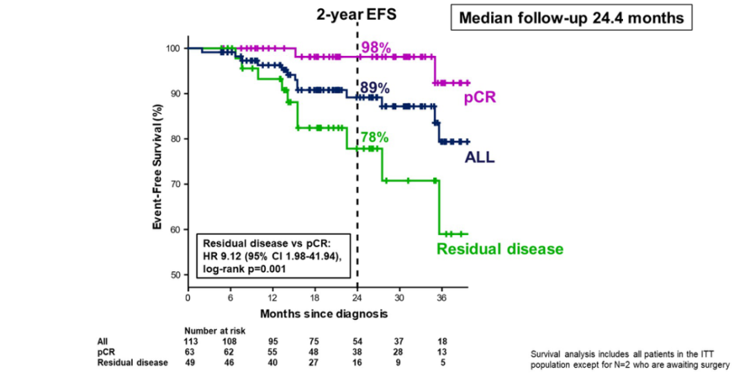 中位随访21个月,所有患者2年EFS为88%;其中pCR组为98%,非pCR组为82%。