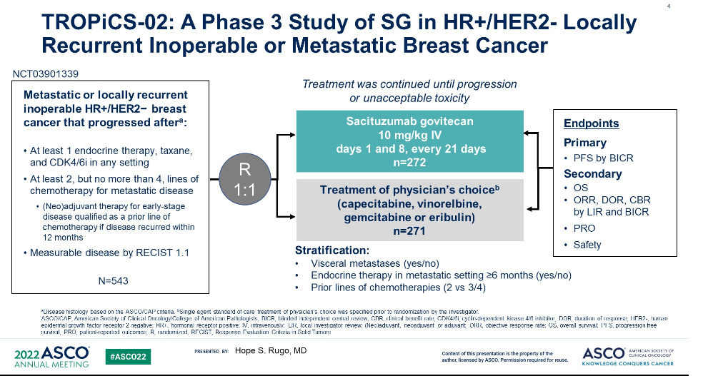 LBA1001-Primary results from TROPiCS-02: A randomized phase 3 study of sacituzumab govitecan (SG) versus treatment of physician’s choice (TPC) in patients (Pts) with hormone receptor–positive/HER2-negative (HR+/HER2-) advanced breast cancer.