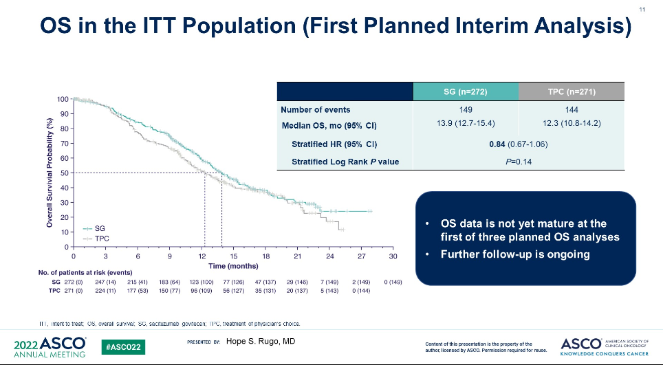 总体而言,SG组有74%的患者出现≥3级的不良事件(AE),TPC组有60%的患者出现了≥3级的不良事件;SG组vs TPC组中性粒细胞减少(51% vs 39%)和腹泻(10% vs 1%)最为常见。两组患者中因AE导致停药的患者比例较低,SG与TPC组分别为6% vs 4%。SG组有1例与治疗相关的死亡;TPC组中患者没有出现治疗相关的死亡。