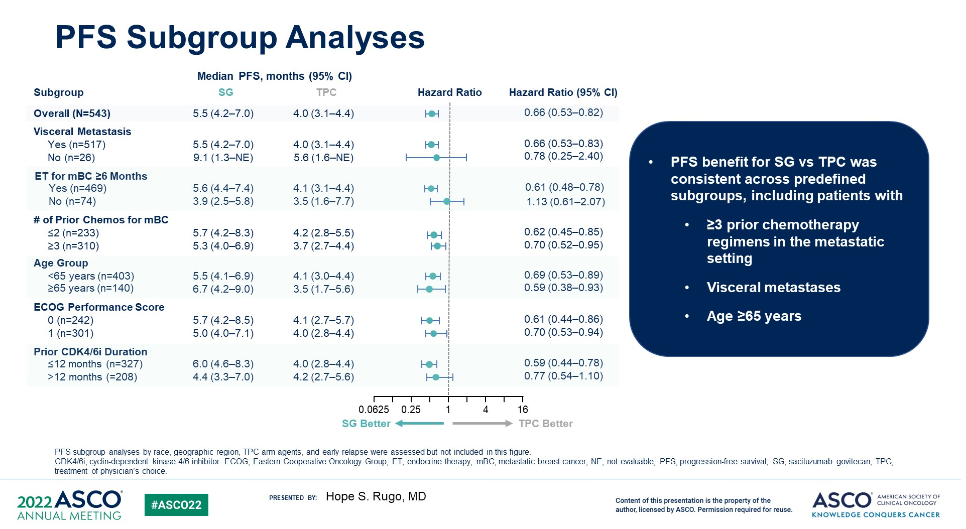 结果:数据截止至2022年1月3日,分别有272名和271名患者随机接受SG和TPC治疗。SG组与TPC组的患者特征相似(MBC患者既往接受化疗方案的中位数为3线[范围,0~8];95%有内脏转移,86%MBC接受过6个月以上的内分泌治疗,60%的患者之前接受过12个月内的CDK4/6 抑制剂治疗,38%的患者接受过超过12个月的CDK4/6抑制剂治疗。SG组(与TPC组相比)改善了中位PFS(5.5 vs 4.0 个月;HR=0.66;95% CI:0.53~0.83;P=0.0003);两组患者6个月和12个月的PFS率分别为46.1% vs 30.3%和21.3% vs 7.1%。