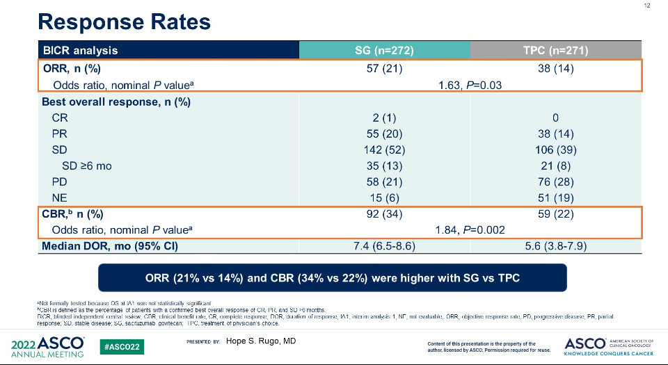 SG组vs TPC组在OS上显示出了并不显著的差异(13.9 vs 12.3个月;HR=0.84;P=0.143);相较于TPC组,SG组的ORR(21% vs 14%)和临床获益率(34% vs 22%)更高,两组中位缓解持续时间分别为 7.4个月vs 5.6个月。
