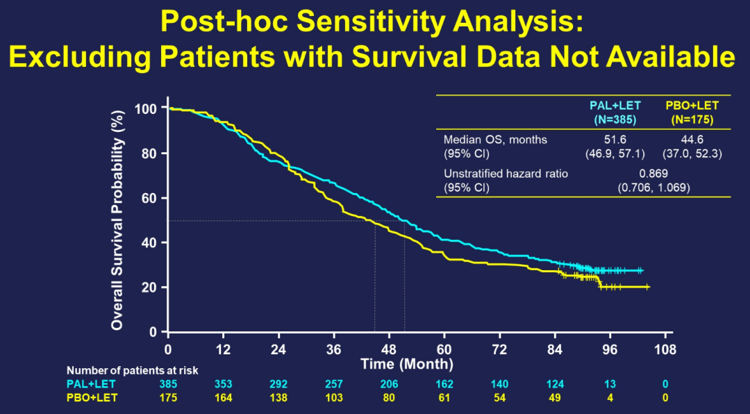 中位随访时间为90个月,PAL+LET组和LET组患者的中位OS没有显著差异(53.9 vs 51.2个月;HR 0.956,95%CI:0.777~1.177;P=0.3378)。排除掉撤出研究或失访患者(分别有21%和13%)的事后敏感性分析显示,PAL+LET组和LET组的OS分别为51.6个月和44.6个月(HR 0.869,95%CI:0.706~1.069)。