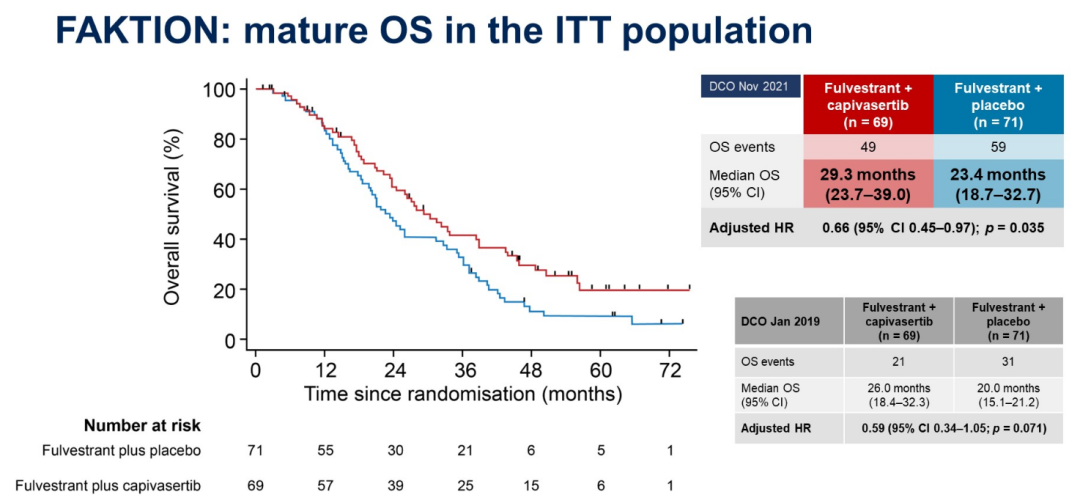 此次报告的OS结果显示,虽然ITT人群两组间OS没有显著差异,但Capivasertib组仍延长了将近半年,尤其是PIK3CA/AKT/PTEN通路异常患者的OS显著延长了19个月,死亡风险降低54%。FAKTION研究的成功填补了AKT抑制剂靶向治疗的空白。在晚期耐药乳腺癌精准检测引导精准治疗的路上,为患者提供了一种新的选择。