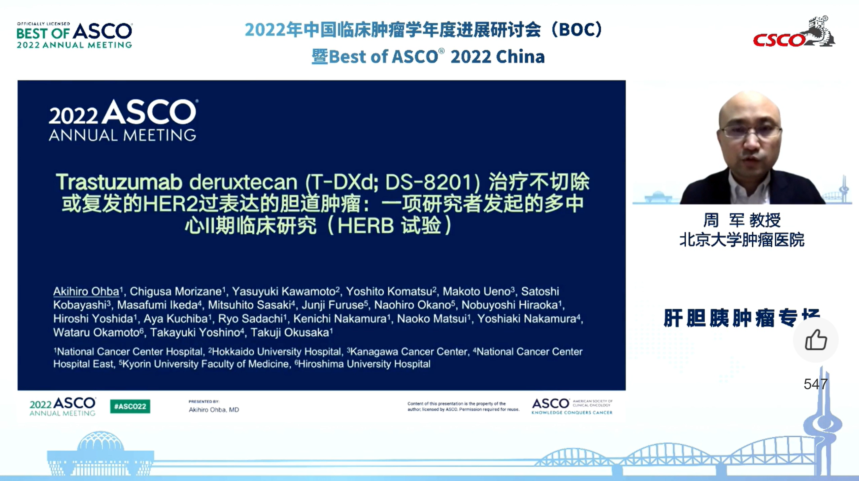 刘秀峰教授介绍了中山大学肿瘤防治中心团队在ASCO大会上汇报的一项Ⅲ期研究显示,FOLFOX术后辅助肝动脉灌注化疗(HAIC)可改善肝癌微血管侵犯患者的预后(摘要号:4013)。北京大学肿瘤医院周军教授介绍了DS-8201用于治疗HER2表达不可切除或复发性胆管癌的Ⅱ期HERB研究(摘要号:4006),以及Futibatinib用于FGFR2融合/重排肝内胆管癌的FOENIX-CCA2研究最新数据(摘要号:4009)。吴剑挥教授介绍了吉西他滨±尼妥珠单抗用于治疗K-RAS野生型局部晚期或转移性胰腺癌的Ⅲ期研究(摘要号:LBA4011),以及不可切除局晚期胰腺癌患者诱导化疗后接受放化疗或单独化疗的CONKO-007研究结果(摘要号:4008)。