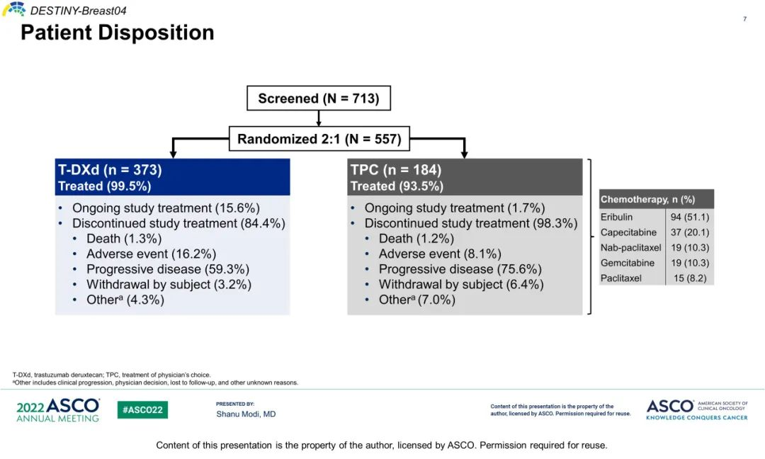 2018年12月27日至2021年12月31日,共筛选713例HER2低表达转移乳腺癌患者拟进入试验。最终将557例患者进行随机分配,其中,T-DXd组373例患者,医生选择组184例患者。其中HR+队列由331例(88.7%)T-DXd组和163例(88.6%)医生选择组患者组成。在医生选择组中,患者分别接受艾立布林(51.1%)、卡培他滨(20.1%)、白蛋白结合型紫杉醇(10.3%)、吉西他滨(10.3%)或紫杉醇(8.2%)治疗。